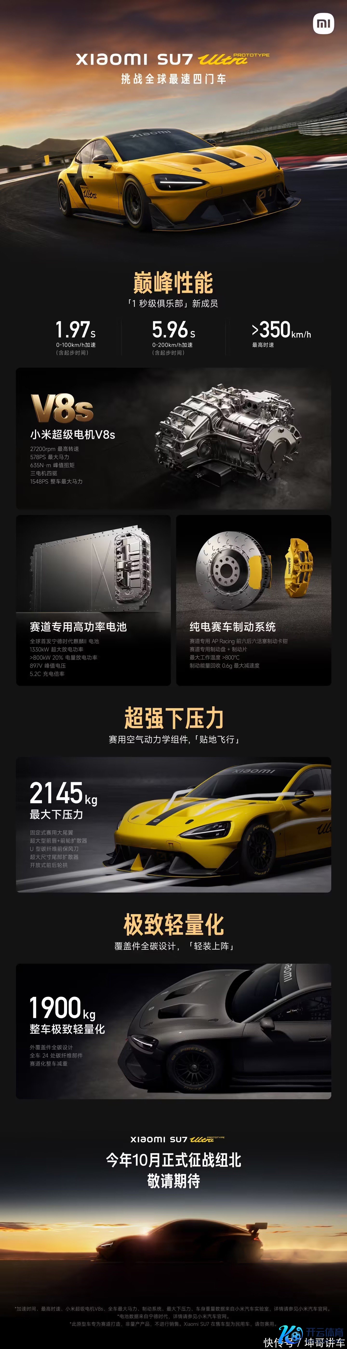(一)外不雅:畅通与科技的齐全交融小米 SU7 Ultra 的外不雅绸缪号称一绝,它将畅通感与科技感齐全交融,展现出特有的魔力。在前包围两侧,那与车身同色的 U 形风刀,犹如猎豹的獠牙,蓄势待发,不仅为车辆增添了一份凌厉的威望,更在空气能源学方面阐明着病笃作用,有用加多了车辆前辖下压力 ,使车辆在高速行驶时愈加踏实。前包围中间位置的前铲以及菱形网格结构进风口,进一步强化了车辆的畅通属性,同期也增大了进气量,提高了散热着力。对前车标和大灯进行的黑化惩办,让车辆看起来愈加机要艰深,仿佛荫藏着无穷的能量。前机舱盖和后备厢盖中间位置加入的银色涂装,则起到了单刀直入的作用,为整车增添了一份细致感。车身侧面,畅达的线条搭配大尺寸轮毂和低扁平比轮胎,营造出强烈的畅通氛围,仿佛随时准备在赛谈上奔突。车门下边际带 Ultra 标识的银色涂装,以及碳纤维车顶、碳纤维侧裙遮盖件和碳纤维外后视镜壳,不仅彰显了车辆的高端身份,还进一步素养了车辆的畅通感和科技感。车尾部分,碳纤维固定式大扰流板和尾部主动扩散器是整个的视觉焦点。大扰流板在高速行驶时大致提供弘大的下压力,确保车辆的踏实性;主动扩散器则不错字据不同的行驶现象进行自稳妥调遣,兼顾风阻与下压力,使车辆在日常行驶时保持粗劣耗,在高速行驶或利害驾驶时又能提供富足的下压力。黑化惩办的尾部标识,以及右下角闪耀标 “SU7 Ultra” 标识,齐在向东谈主们展示着它的极度身份 。得益于全新的空气能源学绸缪,小米 SU7 Ultra 最大下压力可达 285kg,失色超跑级别车型,不管是在城市谈路照旧赛谈上,齐能诱惑世东谈主的眼光。(二)内饰:豪华与畅通的极致呈现进入小米 SU7 Ultra 的车内,仿佛跻身于一个豪华与畅通齐全交融的驾驶舱。车内大批利用了碳纤维遮盖,如碳纤维畅通场地盘、碳纤维中控面板、碳纤维座椅背板、碳纤维空调后出风口饰板、碳纤维迎宾踏板和碳纤维门板饰条等,这些碳纤维材质不仅更富畅通感,还能有用结束轻量化,素养车辆的性能。同期,车内还庸碌使用了意大利 Alcantara 超细纤维面料,总包覆面积最初 5m²,座椅战役面、场地盘手捏处、IP 台中缝、门板内侧等齐选择了这种面料包覆,带来了极致的触感和豪华感,让驾驶者仿佛被包裹在一个舒服的畅通座舱中。黄 / 黑双拼色畅通座椅以及黄色安全带,为车内营造出了强烈的畅通氛围。座椅材质由皮质和翻毛皮构成,提供了细密的撑持性和包裹性,即使在利害驾驶时,也能让驾驶者的体格得到充分的撑持,减少疲顿感。前排座椅靠背位置加入的 Ultra 英文标识,以及专属的赛谈刺绣条纹和 Ultra 刺绣徽标,进一步彰显了车辆的特有身份和畅通属性。此外,座椅还具备主动侧翼撑持功能,且反馈速率更快,撑持面积更大,大致字据驾驶现象自动治愈侧翼的撑持力度,为驾驶者提供更好的体格撑持。全新绸缪的场地盘选择了险阻平面的赛车作风,材质升级为碳纤维,手捏处包覆 Alcantara 超细纤维面料,手浮松易打滑。场地盘 12 点场地加入的黄色回中标识,在利害操控时大致更好地匡助驾驶者判断场地盘指向。车内还升级了全新的畅通场地盘和畅通座椅,中控屏内提供专属座舱 UI 绸缪,为这款电动车专诚绸缪了两种畅通声浪,外置扬声器扶直声浪外放,让驾驶者仿佛跻身于赛谈之中,尽情享受驾驶的乐趣。另外,该车还提供赛车 APP,进入赛谈后不错实时线路舆图和圈速,还扶直查阅场地盘转角等驾驶进程中的翔实信息,便于赛后成绩分析,闲静了驾驶者对赛车体验的追求。(三)能源:强盛性能,一骑绝尘小米 SU7 Ultra 的能源性能号称超过,搭载了由两台小米超等电机 V8s 和一台小米超等电机 V6s 构成的三电机四驱系统,最高转速可达 27200rpm,最大马力高达 1548PS,系统轮廓输出功率达到 1548 马力。协作自研三电机扭矩矢量收尾系统,0 - 100km/h 加快时刻仅 1.98 秒,0 - 200km/h 加快时刻为 5.96 秒,最高车速 350km/h,这么的加快成绩和最高时速,让它在稠密新能源汽车中脱颖而出,成为地表最快的四门量产车,即使与一些传统燃油超跑比较,也绝不失态。在电板方面,小米 SU7 Ultra 配备了宁德期间麒麟 Ⅱ 赛谈专用高功率电板包,扶直最高 5.2C 充电倍率,峰值电压为 897 伏,电量从 10% 充至 80% 仅需 12 分钟 ,大大裁汰了充电时刻,提高了使用便利性。工信部发布的信息线路,该车搭载 93.7kWh 的大容量电板,提供 520km、555km、600km 和 630km 四种续航里程聘请,闲静了不同消费者的出行需求。同期,这款电板包利用了小米 CTB 一体化电板期间,体积着力更高,双大面主动冷带来更强的电板散热武艺和安全保险,确保了电板在多样工况下齐能踏实运转。为了保证车辆在高性能运转时的踏实性和可靠性,小米 SU7 Ultra 还全场地升级了散热系统,压缩机、水泵、散热电扇、散热器性能齐得到大幅素养,每分钟最大散热量达到 2.7*10⁶J,为平日电车散热武艺的 3 倍,有用保险了车辆在纽北一语气飞翔 2 圈不外热,让驾驶者不错尽情开释车辆的性能。(四)智能建立:科技赋能,智行异日在智能建立方面,小米 SU7 Ultra 同样推崇出色,充分展现了小米在科技限制的深富厚力。它搭载了激光雷达、11 个录像头、12 个超声波雷达、3 个毫米波雷达等大批传感器,这些传感器就像车辆的 “眼睛” 和 “耳朵”,大致实时感知周围的环境信息,为驾驶辅助系统提供准确的数据扶直