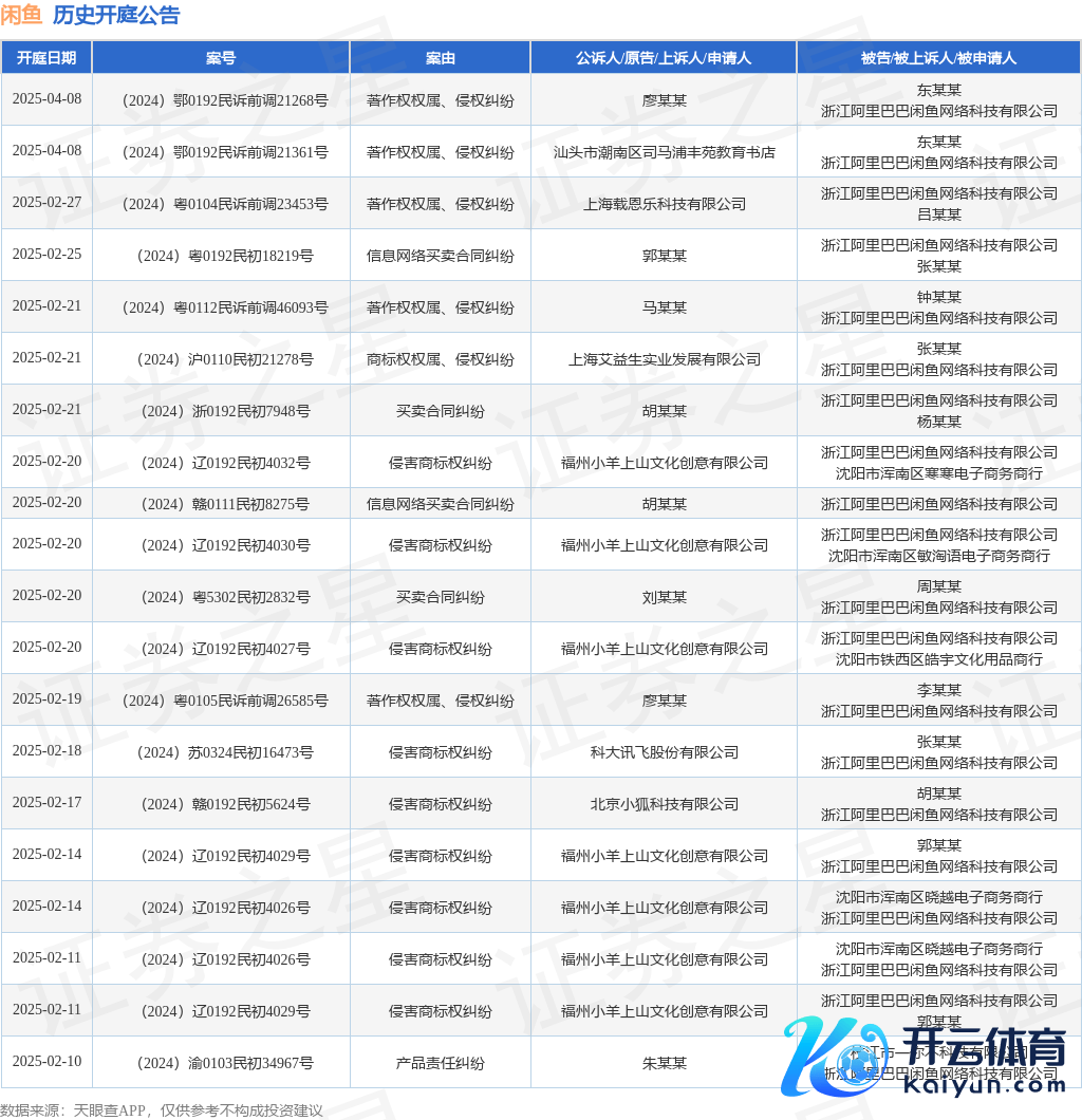 案号:(2024)苏0324民初13154号审理法院:睢宁县东说念主民法院案由:居品销售者牵累纠纷当事东说念主信息: 原告/上诉东说念主:鲍某某 被告/被上诉东说念主:卢某某、浙江阿里巴巴闲鱼收集科技有限公司开庭日历:2025年1月7日凭据统计,近一年内以浙江阿里巴巴闲鱼收集科技有限公司为当事东说念主的历史开庭公告有676则,其中案由为“收集处事契约纠纷”的公告以266则居首,其次为“信息收集商业契约纠纷”有103则,“侵害商标权纠纷”有91则。历史开庭公告(前20条)如下: