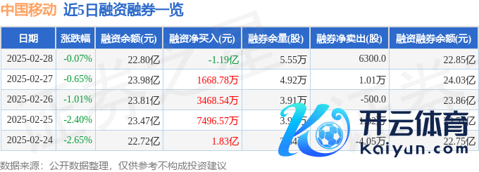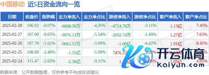 本站音问,截止2025年2月28日收盘,中国迁徙(600941)报收于106.92元,下落0.07%体育游戏app平台,换手率1.57%,成交量14.2万手,成交额15.21亿元。