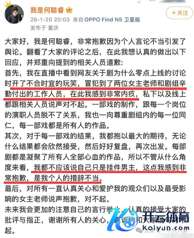 昨晚何聪睿针对此事发文谈歉了,回来一下:让网友"赖女主"是不对时宜的打趣;说我方"挂件男主"是个东谈主的措辞不当。