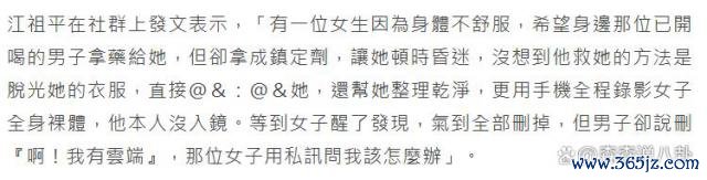 江祖平勇敢为她东谈主发声,获取网友的提拔和力挺,她此前曾屡次发文,曝光其中内幕,受害女演员本日因体魄不适,但愿傍边的男东谈主襄理拿药,没思到对方会对其下药迷奸,令东谈主气愤。